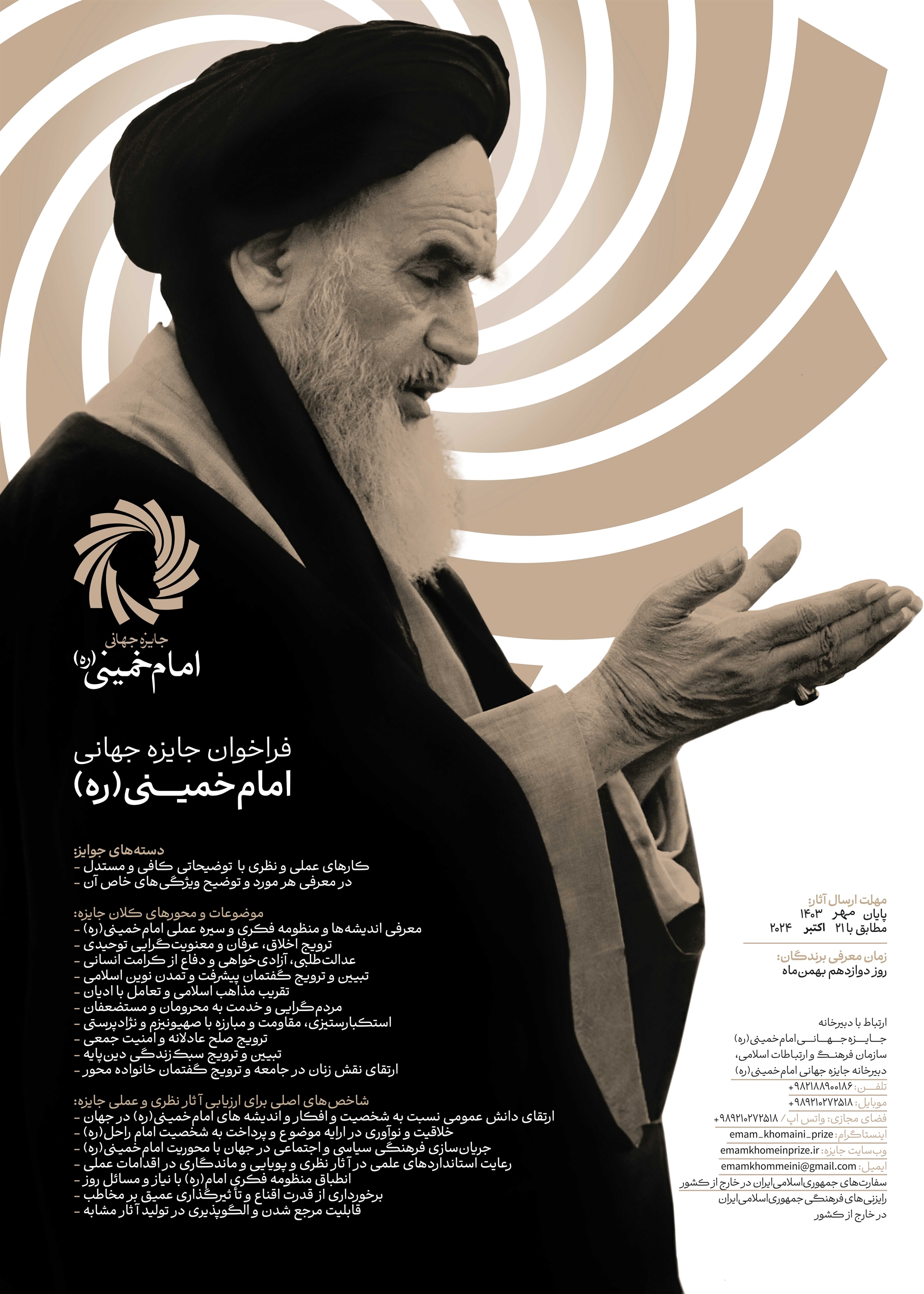 در راستای تکریم و ترویج اندیشه‌های والای بنیانگذار جمهوری اسلامی ایران، حضرت امام خمینی (ره)، نخستین دوره جایزه جهانی به نام ایشان در دو بخش نظری و عملی اعلام فراخوان شده است. این رویداد مهم فرهنگی و علمی، با هدف شناسایی و تقدیر از اندیشمندان، پژوهشگران و فعالان برجسته‌ای که در مسیر تحقق آرمان‌های امام راحل (ره) گام برمی‌دارند، طراحی و اجرا می‌شود.