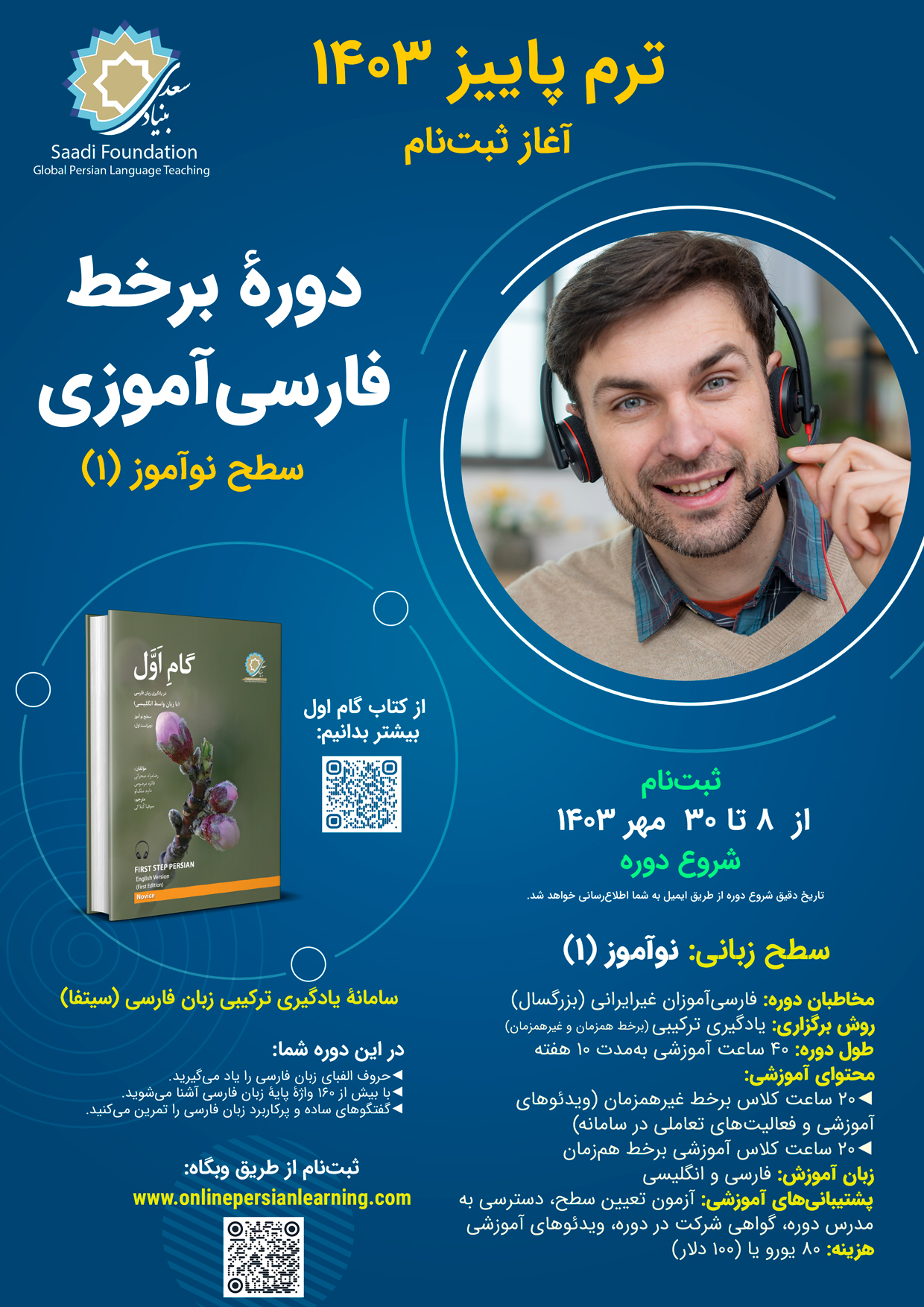 بنیاد سعدی در نظر دارد دوره آموزش زبان فارسی و انگلیسی به صورت برخط از طریق سامانه یادگیری ترکیبی زبان فارسی (سیتفا) برگزار نماید. علاقمندان می‌توانند جهت ثبت نام و کسب اطلاعات بیشتر به آدرس اینترنتی ذیل مراجعه نمایند.