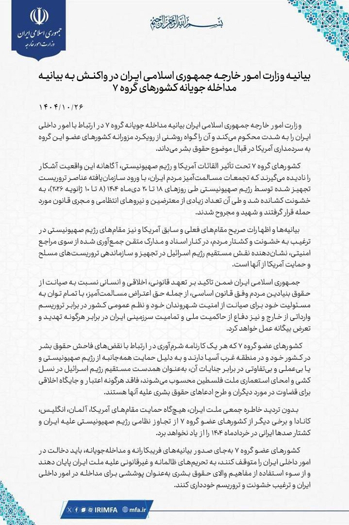 بیانیه وزارت امور خارجه جمهوری اسلامی ایران در واکنش به بیانیه مداخله جویانه  کشورهای گروه 7