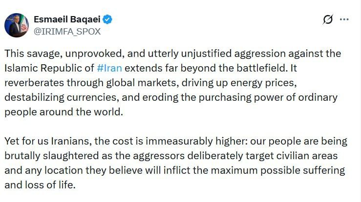 پیام سخنگوی وزارت امور خارجه درباره آثار تجاوز وحشیانه آمریکا و رژیم صهیونیستی، بر ایران و جهان جناب آقای اسماعیل بقائی، سخنگوی وزارت امور خارجه، طی پیامی در شبکه ایکس نوشت: این تجاوز وحشیانه، بیدلیل و کاملاً غیرقابل توجیه علیه جمهوری اسلامی #ایران، فراتر از میدان نبرد گسترش مییابد. این تجاوز در بازارهای جهانی طنینانداز میشود، قیمت انرژی را افزایش میدهد، ارزها را بیثبات میکند و قدرت خرید مردم عادی در سراسر جهان را کاهش میدهد. با این حال، برای ما ایرانیان، هزینه آن به مراتب بیشتر است: مردم ما به طرز وحشیانهای قتل عام میشوند، زیرا متجاوزان عمداً مناطق غیرنظامی و هر مکانی را که به گمان آنها حداکثر رنج و تلفات جانی ممکن را به بار خواهد آورد، هدف قرار میدهند.