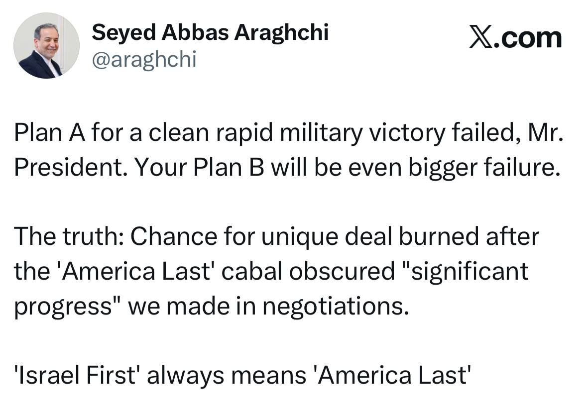 هشدار دکتر عراقچی به ترامپ: طرح «ب» شما حتی شکست بزرگتری خواهد بود دکتر سید عباس عراقچی وزیر امور خارجه جمهوری اسلامی ایران در پیامی در شبکه ایکس ضمن هشدار به رئیس جمهور آمریکا نوشت: طرح «الف» برای دستیابی به یک پیروزی نظامی سریع و بیدردسر شکست خورد، آقای رئیسجمهور. طرح «ب» شما حتی شکست بزرگتری خواهد بود. واقعیت این است: فرصت دستیابی به یک توافق منحصربهفرد از بین رفت، پس از آنکه باند «آخر امریکا » «پیشرفت قابل توجهی» را که در مذاکرات به دست آمده بود، پنهان کرد. «اول اسرائیل» همیشه به معنای «آخر آمریکا» است.